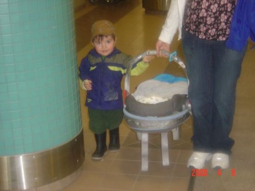 Big Brother Nigel helping carry his new brother home from the hospital.
